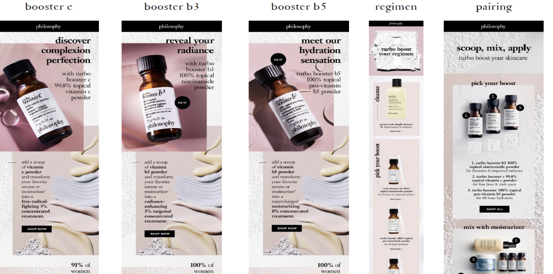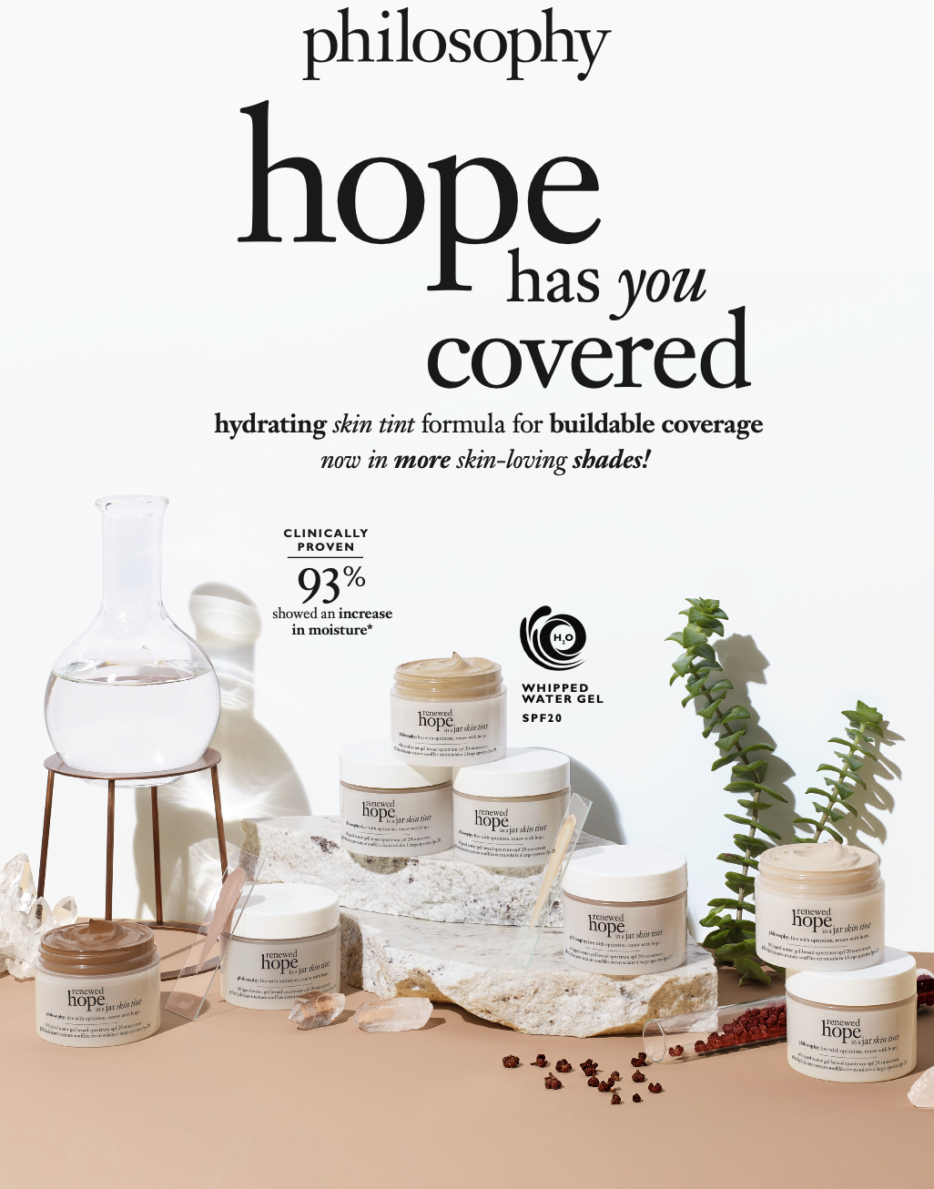 Highlights for Global Skincare Launches, including skincare/makeup category hybrid Renewed Hope in a Jar Glow Drops, Renewed Hope in a Jar Skin Tint, Clear Days Ahead Acne Treatment Drying Lotion, Renewed Hope in a Jar Peeling Mask, Purity Made Simple Moisturizer & Turbo Booster Powders digital rollout.