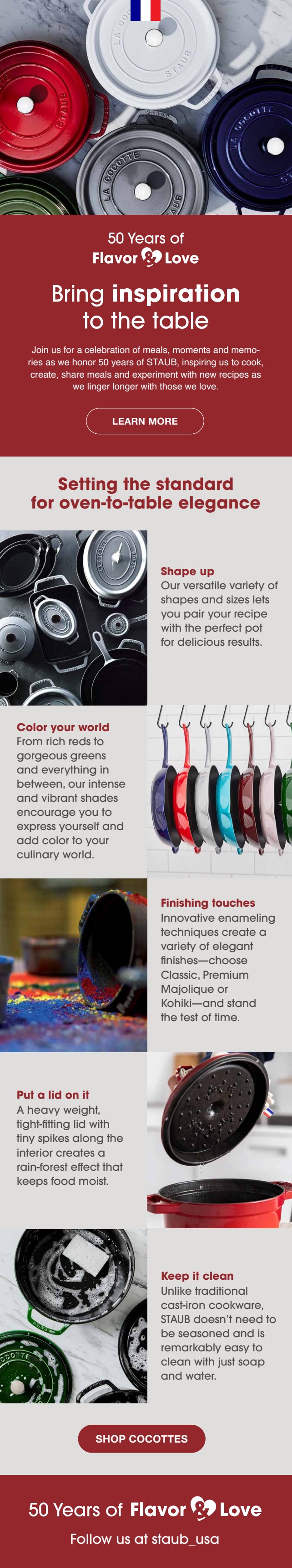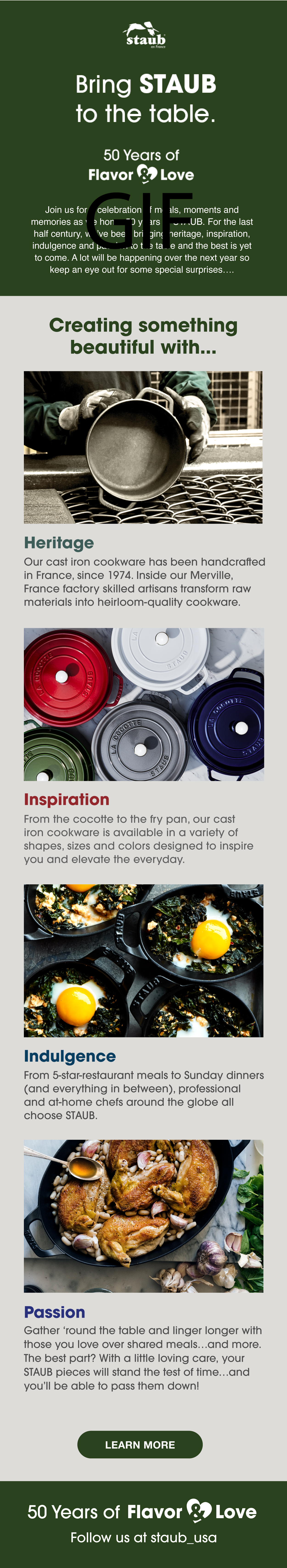 Global STAUB 50th Anniversary Campaign, with digital, social and retail creative designed to increase brand awareness and consumer engagement. Includes two emails a month for an entire year, focusing on the brand moments and pillars, along with branded and paid social.